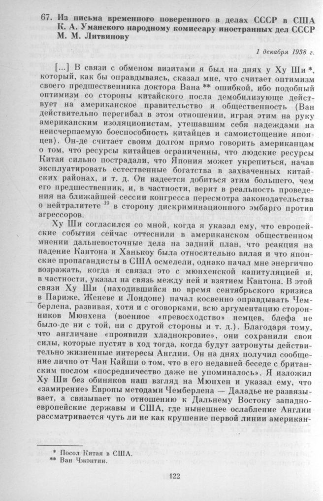 Из письма временного поверенного в делах СССР в США К. А. Уманского народному комиссару иностранных дел СССР М. М. Литвинову. 1 декабря 1938 г. // АВП СССР, ф. 05, оп. 18, п. 147, д. 132, л. 96—98.; СССР в борьбе за мир... С. 100-101.