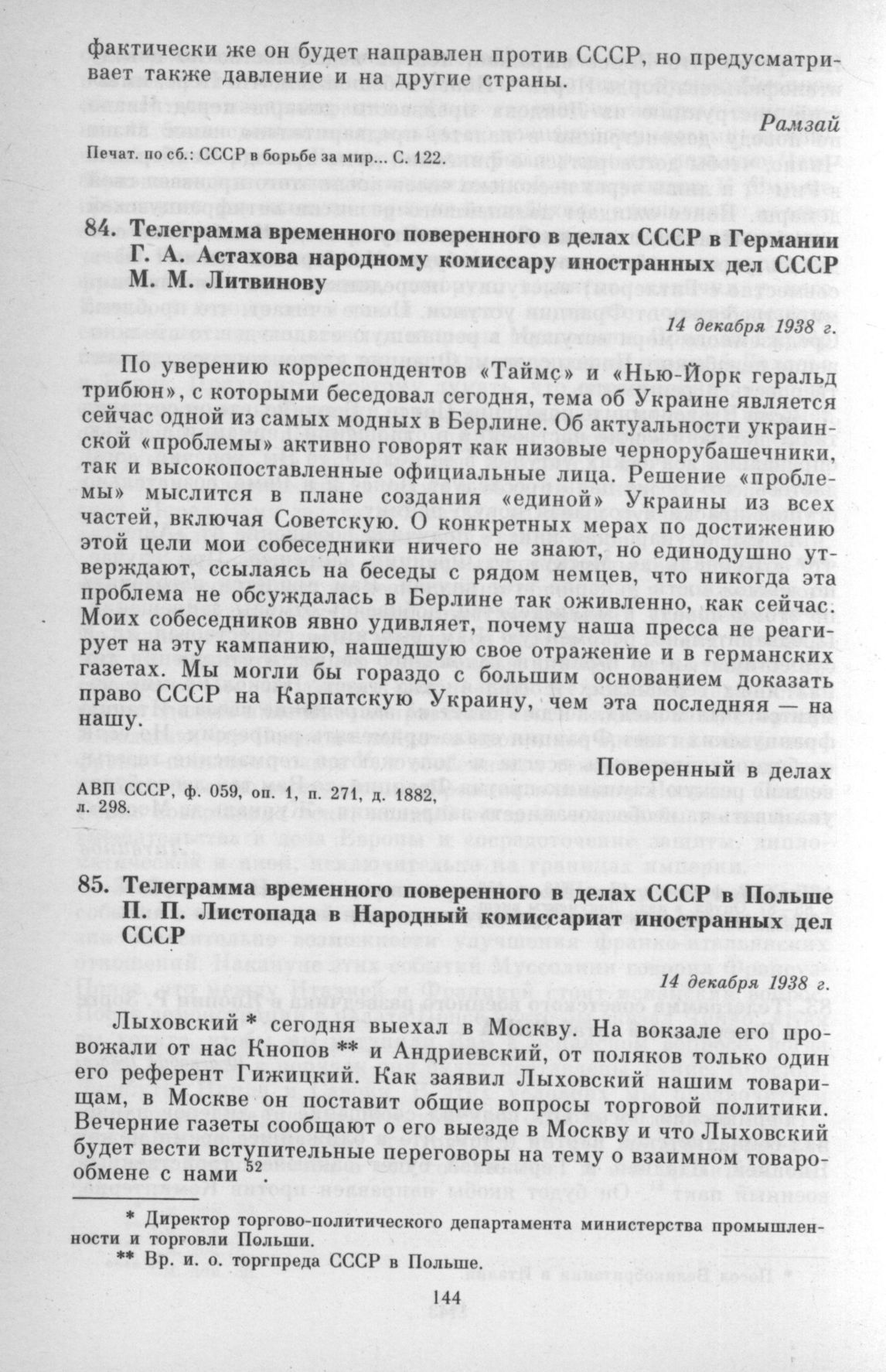 Телеграмма временного поверенного в делах СССР в Германии Г. А. Астахова народному комиссару иностранных дел СССР М. М. Литвинову. 14 декабря 1938 г. // АВП СССР, ф. 059, оп. 1, п. 271, д. 1882, л. 298.