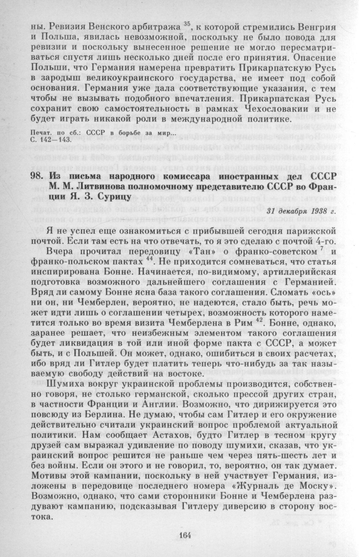 Из письма народного комиссара иностранных дел СССР М. М. Литвинова полномочному представителю СССР во Франции Я. 3. Сурицу. 31 декабря 1938 г. // АВП СССР, ф. 05, оп. 18, п. 148, д. 158, л. 100—102.; СССР в борьбе за мир... С. 143 — 145.