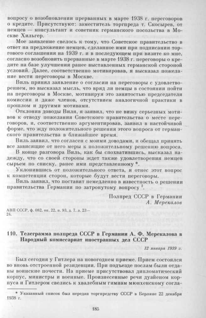 Телеграмма полпреда СССР в Германии А. Ф. Мерекалова в Народный комиссариат иностранных дел СССР. 12 января 1939 г. // АВП СССР, ф. 059, оп. 1, п. 294, д. 2036, л. 17.