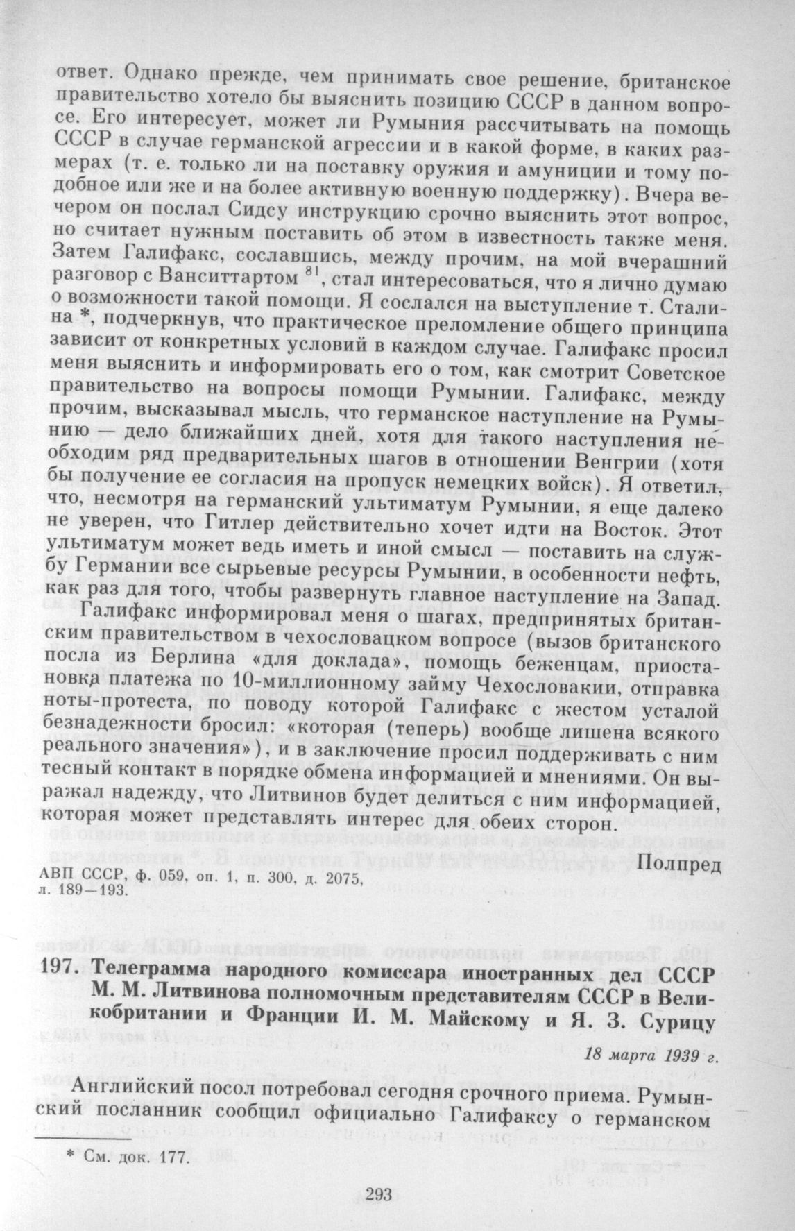 Телеграмма народного комиссара иностранных дел СССР М. М. Литвинова полномочным представителям СССР в Великобритании и Франции И. М. Майскому и Я. 3. Сурицу. 18 марта 1939 г. // АВП СССР, ф. 059, оп. 1, п. 313, д. 2153, л. 142.; СССР в борьбе за мир... С. 246.
