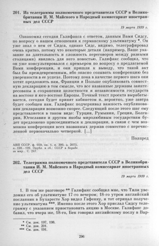 Телеграмма полномочного представителя СССР в Великобритании И. М. Майского в Народный комиссариат иностранных дел СССР. 19 марта 1939 г. // АВП СССР, ф. 059, оп. 1, п. 300, д. 2075, л. 200-201.; СССР в борьбе за мир... С. 248.