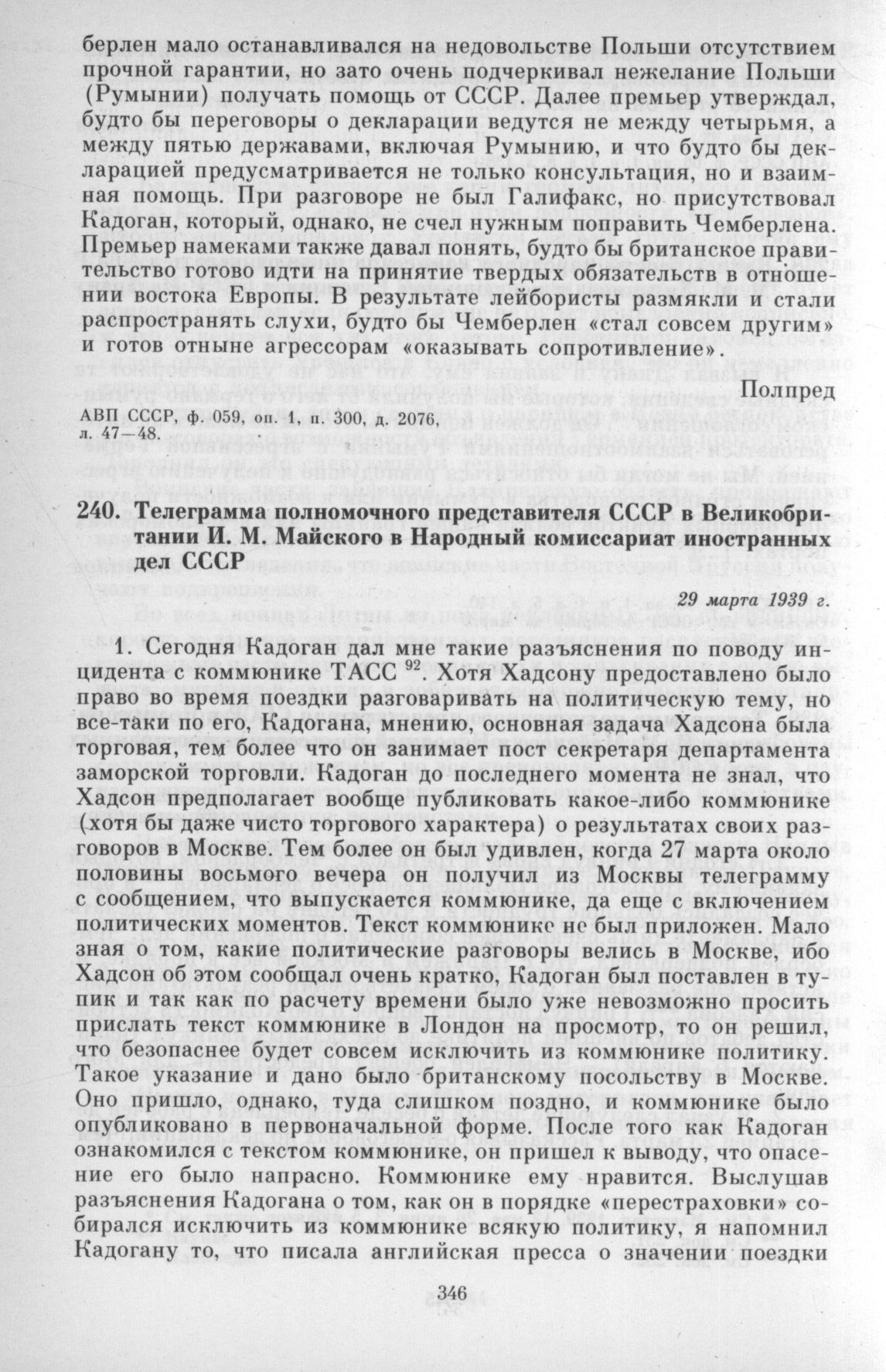 Телеграмма полномочного представителя СССР в Великобритании И. М. Майского в Народный комиссариат иностранных дел СССР. 29 марта 1939 г. // АВП СССР, ф. 059, оп. 1, п. 300, д. 2076, л. 50 - 53.