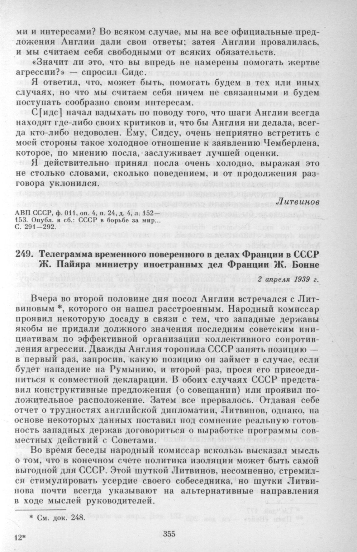 Телеграмма временного поверенного в делах Франции в СССР Ж. Пайяра министру иностранных дел Франции Ж. Бонне. 2 апреля 1939 г. // Documents diplomatiques francais, 1932 — 1939... 2 serie, t. XV, p. 355-356.