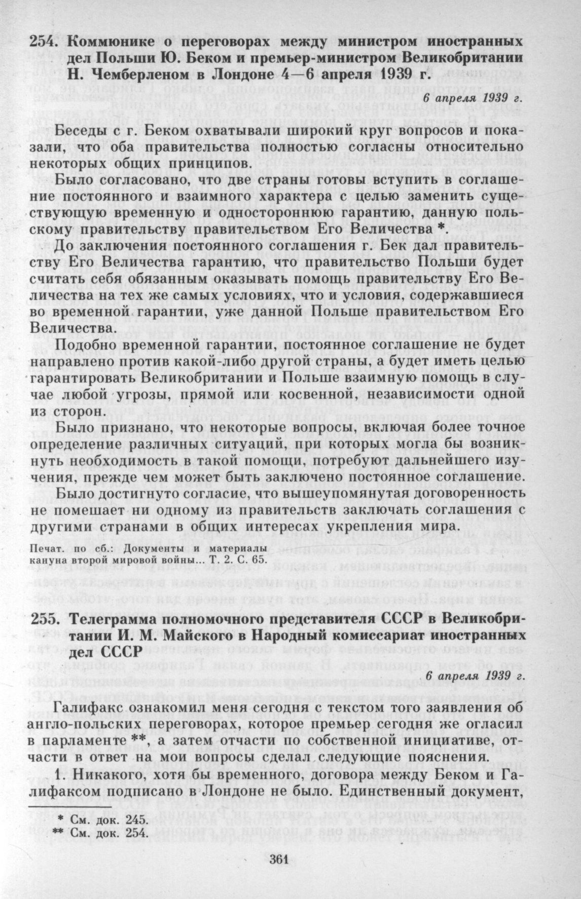 Телеграмма полномочного представителя СССР в Великобритании И. М. Майского в Народный комиссариат иностранных дел СССР. 6 апреля 1939 г. // АВП СССР, ф. 059, оп. 1, п. 300, д. 2076, л. 92-96.