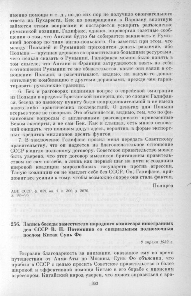 Запись беседы заместителя народного комиссара иностранных дел СССР В. П. Потемкина со специальным полномочным послом Китая Сунь Фо. 8 апреля 1939 г. // АВП СССР. ф. 011, оп. 4, п. 24, д. 7, л. 11-12.
