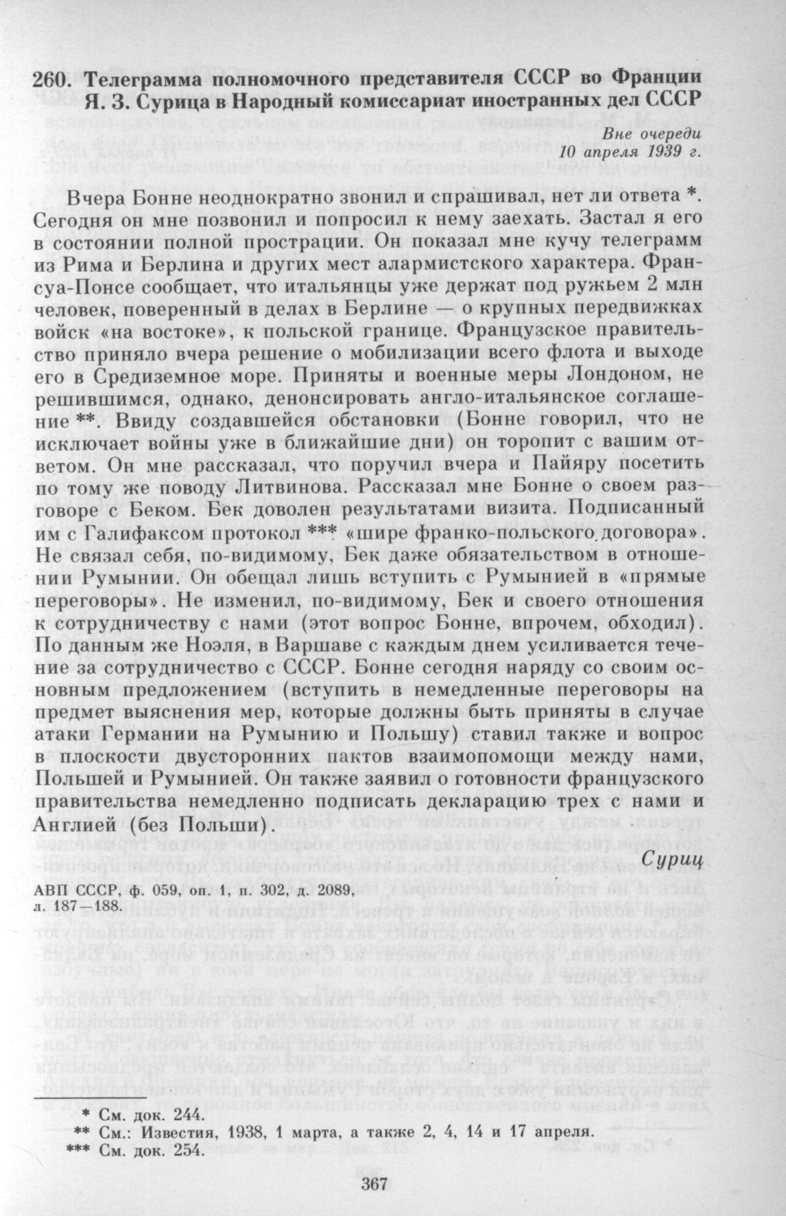 Телеграмма полномочного представителя СССР во Франции Я. 3. Сурица в Народный комиссариат иностранных дел СССР. 10 апреля 1939 г. // АВП СССР, ф. 059, оп. 1, п. 302, д. 2089, л. 187-188.