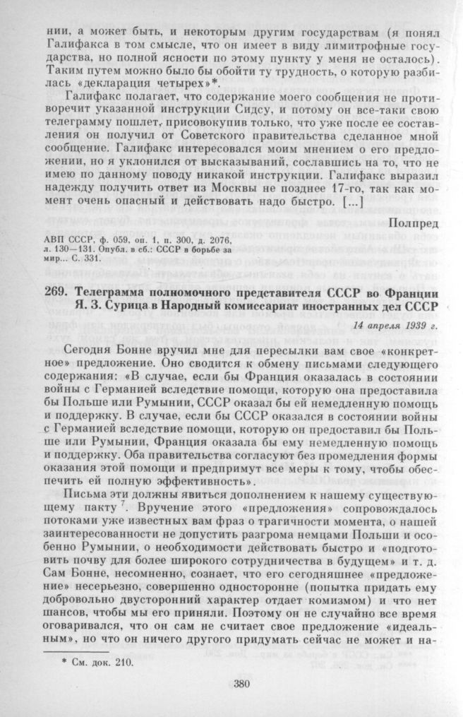 Телеграмма полномочного представителя СССР во Франции Я. 3. Сурица в Народный комиссариат иностранных дел СССР. 14 апреля 1939 г. // АВП СССР, ф. 059, оп. 1, п. 302, д. 2089, л. 204—205.; СССР в борьбе за мир... С. 332.