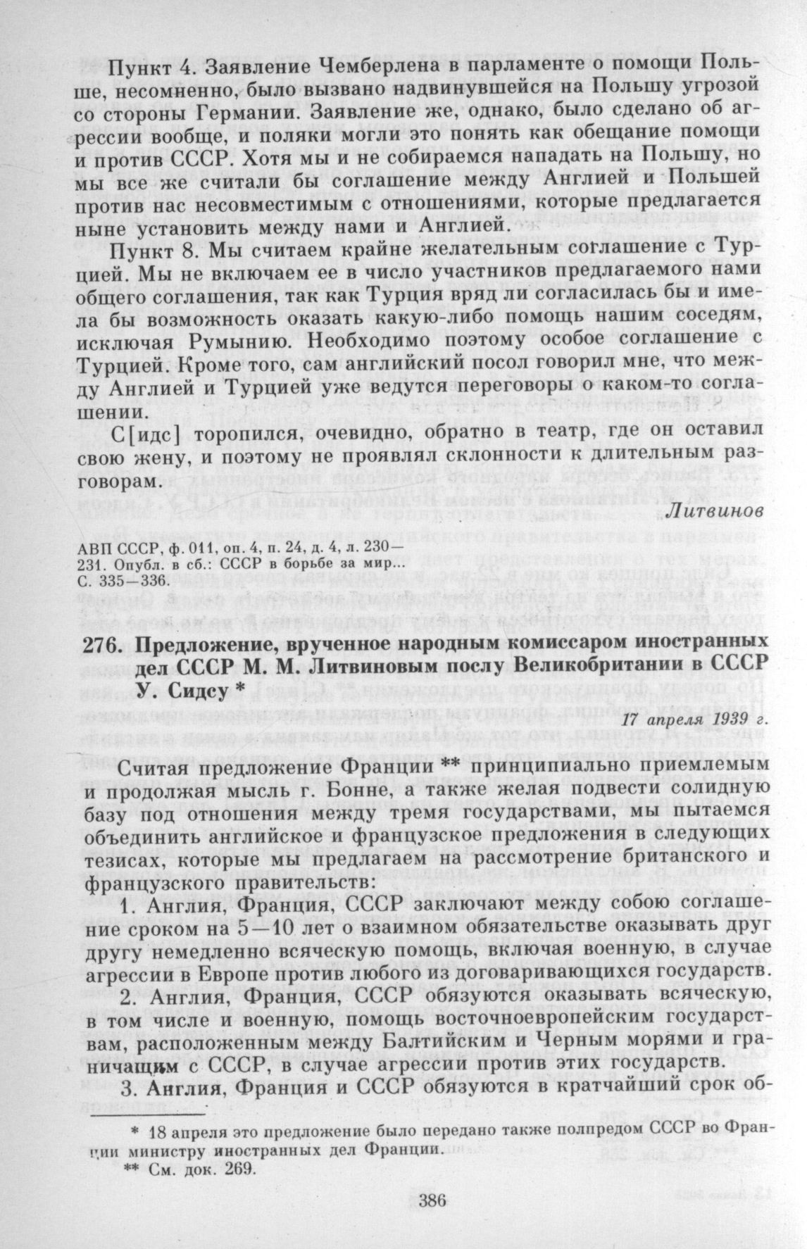 Предложение, врученное народным комиссаром иностранных дел СССР М. М. Литвиновым послу Великобритании в СССР У. Сидсу. 17 апреля 1939 г. // АВП СССР, ф. 06, оп. 1а, п. 25, д. 4, л. 27 — 28.; Документы и материалы кануна второй мировой войны... Т. 2. С. 72.