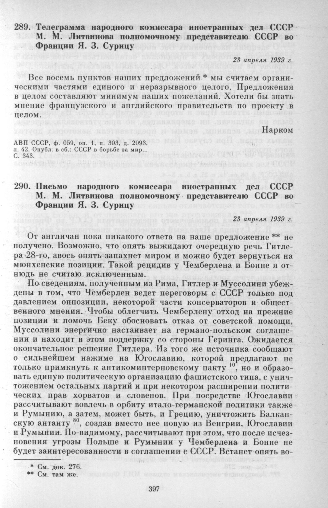 Телеграмма народного комиссара иностранных дел СССР М. М. Литвинова полномочному представителю СССР во Франции Я. 3. Сурицу. 23 апреля 1939 г. // АВП СССР, ф. 059, оп. 1, п. 303, д. 2093, л. 42.; СССР в борьбе за мир... С. 343.