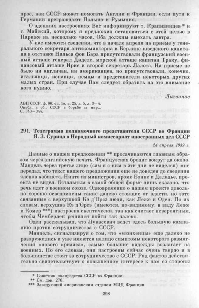 Телеграмма полномочного представителя СССР во Франции Я. 3. Сурица в Народный комиссариат иностранных дел СССР. 24 апреля 1939 г. // АВП СССР, ф. 059, оп. 1, п. 302, д. 2089, л. 233—234.; СССР в борьбе за мир... С. 347.