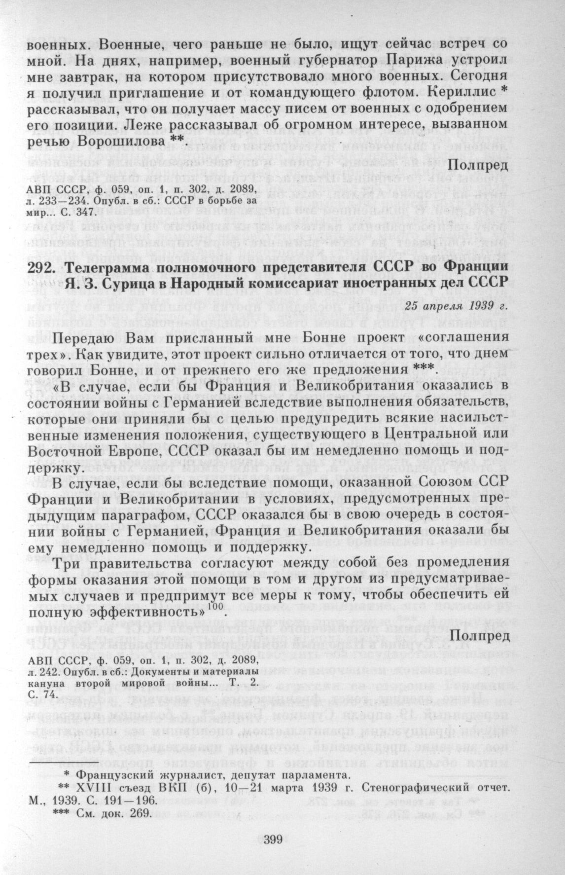 Телеграмма полномочного представителя СССР во Франции Я. 3. Сурица в Народный комиссариат иностранных дел СССР. 25 апреля 1939 г. // АВП СССР, ф. 059, оп. 1, п. 302, д. 2089, л. 242.; Документы и материалы кануна второй мировой войны... Т. 2. С. 74.
