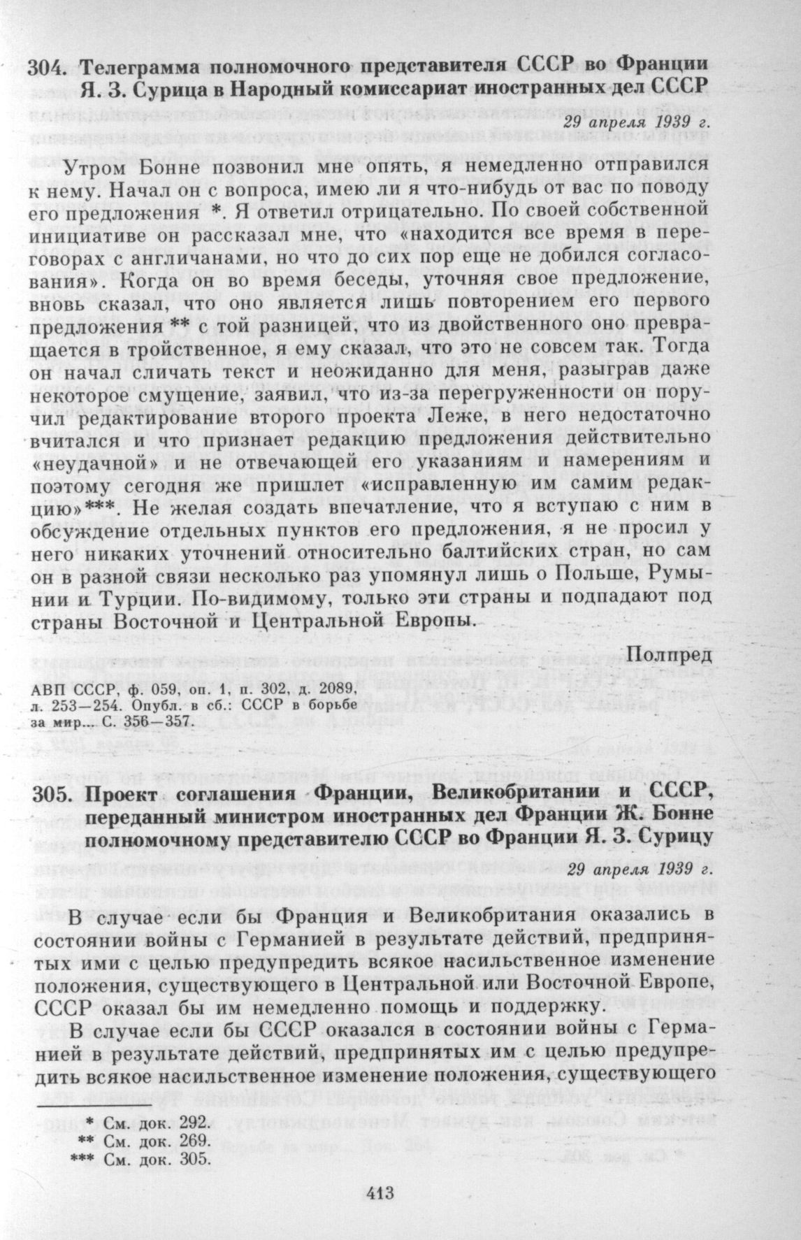 Проект соглашения Франции, Великобритании и СССР, переданный министром иностранных дел Франции Ж. Бонне полномочному представителю СССР во Франции Я. 3. Сурицу. 29 апреля 1939 г. // СССР в борьбе за мир... С. 357.; Documents on British Foreign Policy... Third serie. Vol. V. P. 406.