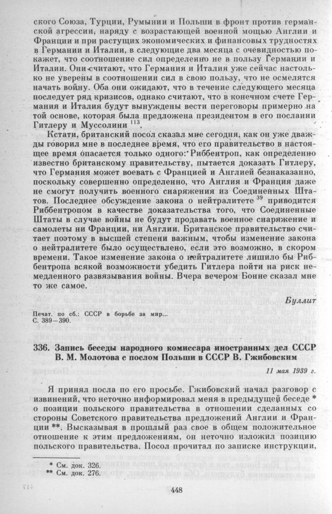 Запись беседы народного комиссара иностранных дел СССР В. М. Молотова с послом Польши в СССР В. Гжибовским. 11 мая 1939 г. // АВП СССР, ф. 06, оп. 1а, п. 26, д. 18, л. 110.; СССР в борьбе за мир... С. 393-394.