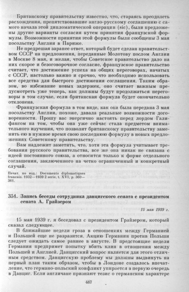 Запись беседы сотрудника данцигского сената с президентом сената А. Грайзером. 15 мая 1939 г. // СССР в борьбе за мир... С. 399-400.