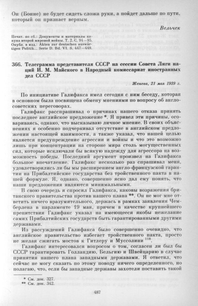 Телеграмма представителя СССР на сессии Совета Лиги наций И. М. Майского в Народный комиссариат иностранных дел СССР. Женева, 21 мая 1939 г. // АВП СССР, ф. 059, оп. 1, п. 298, д. 2057, л. 11 — 12.; СССР в борьбе за мир... С. 408 — 409.