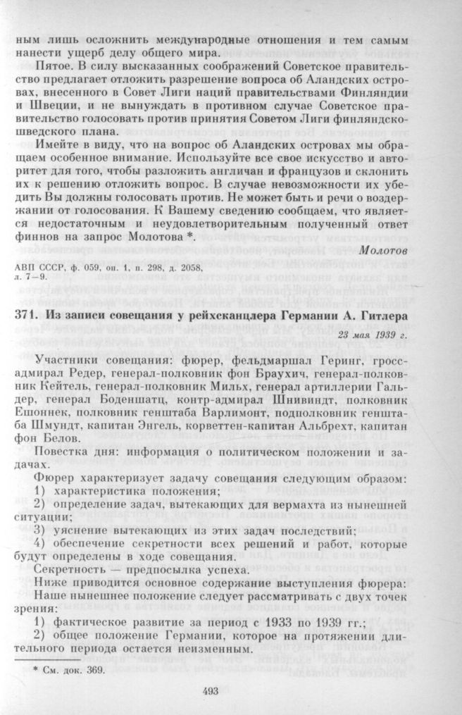 Из записи совещания у рейхсканцлера Германии А. Гитлера. 23 мая 1939 г. // СССР в борьбе за мир... С. 411—413.; Akten zur deutschen auswärtigen Politik. Serie D. Bd. VI. S. 477-483.