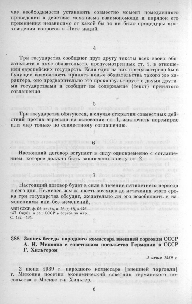 Запись беседы народного комиссара внешней торговли СССР А. И. Микояна с советником посольства Германии в СССР Г. Хильгером. 2 июня 1939 г. // АВП СССР, ф. 0745, оп. 14, п. 32, д. 3, л. 21-23.