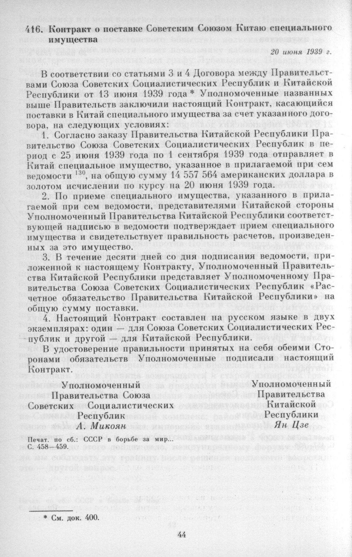 Контракт о поставке Советским Союзом Китаю специального имущества. 20 июня 1939 г. // СССР в борьбе за мир... С. 458 — 459.