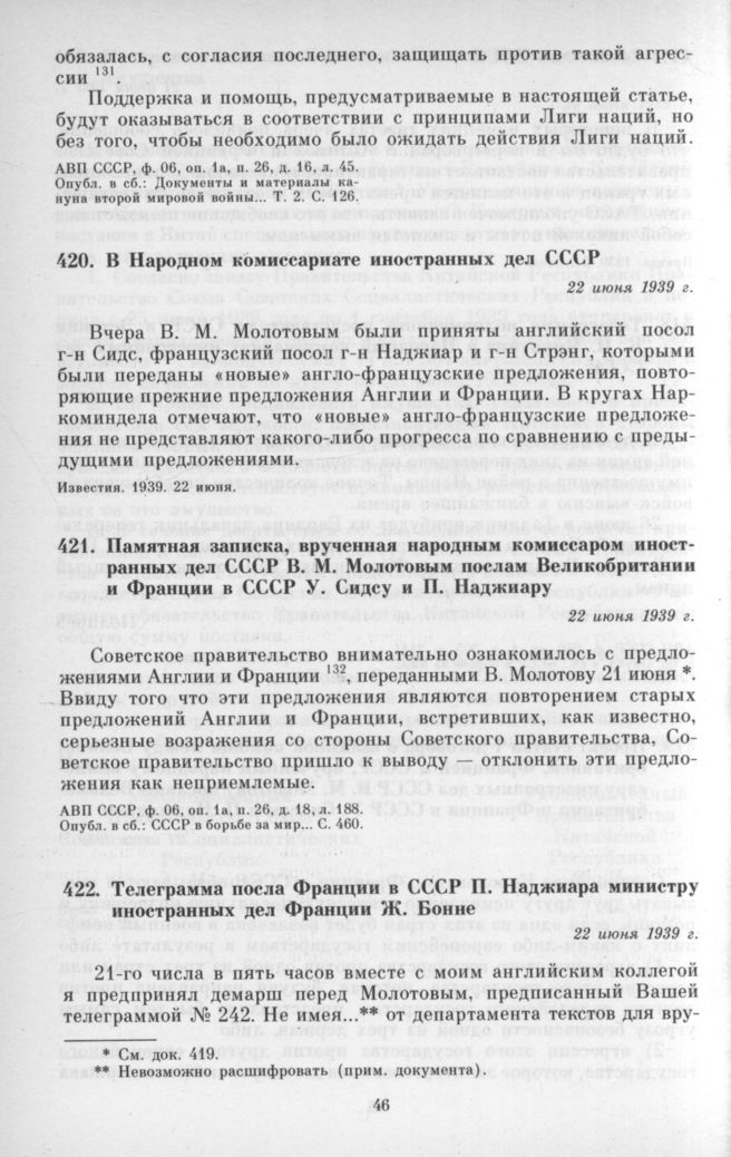 Телеграмма посла Франции в СССР П. Наджиара министру иностранных дел Франции Ж. Бонне. 22 июня 1939 г. // Documents diplomatiques francais... 2 serie. T. XVI, P. 937-938.