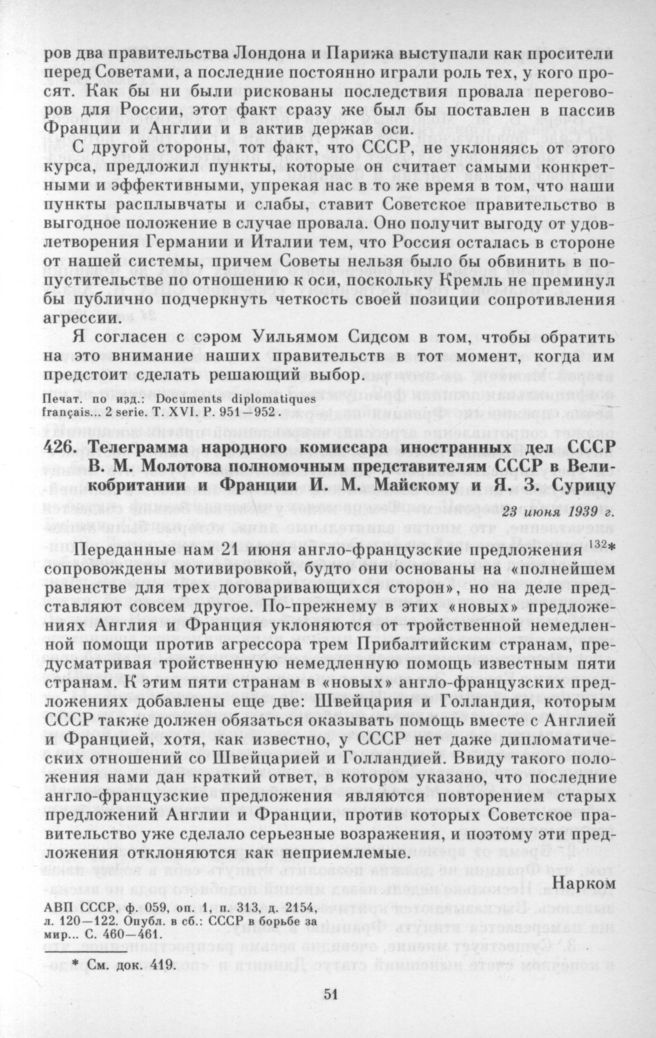 Телеграмма народного комиссара иностранных дел СССР В. М. Молотова полномочным представителям СССР в Великобритании и Франции И. М. Майскому и Я. 3. Сурицу. 23 июня 1939 г. // АВП СССР, ф. 059, оп. 1, п. 313, д. 2154, л. 120 — 122.; СССР в борьбе за мир... С. 460—461.