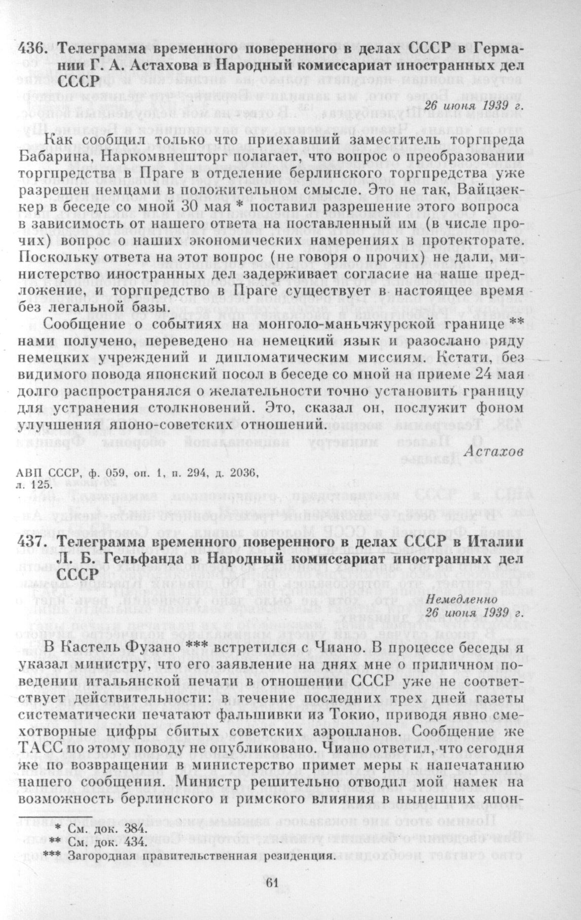 Телеграмма временного поверенного в делах СССР в Германии Г. А. Астахова в Народный комиссариат иностранных дел СССР. 26 июня 1939 г. // АВП СССР, ф. 059, оп. 1, п. 294, д. 2036, л. 125.