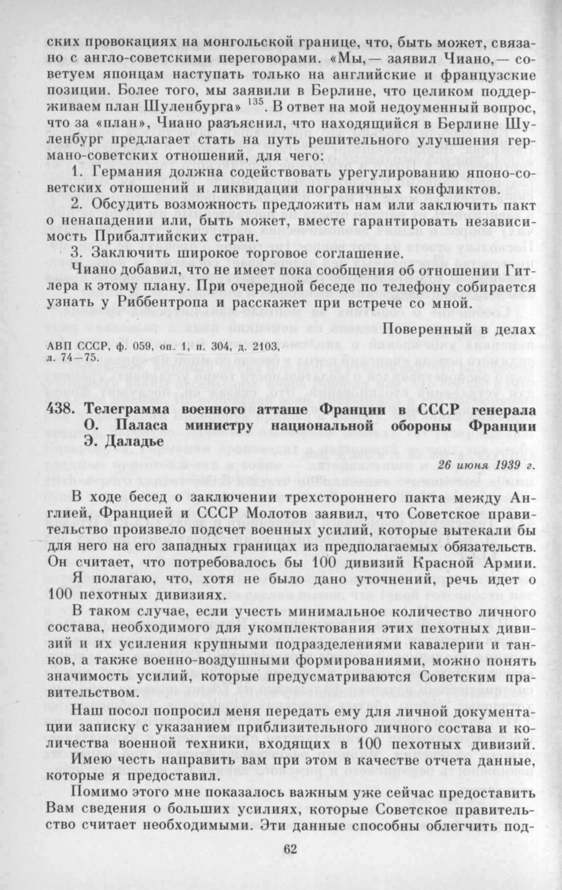 Телеграмма военного атташе Франции в СССР генерала О. Паласа министру национальной обороны Франции Э. Даладье. 26 июня 1939 г. // Documents diplomatiques francais... 2 serie. T. XVII. P. 9.
