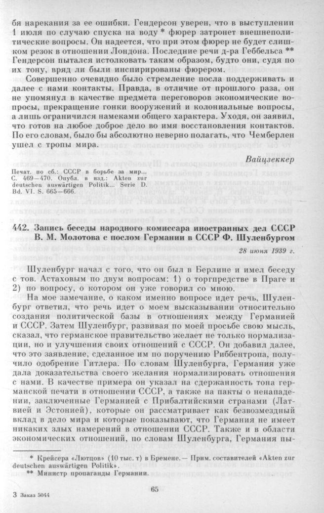 Запись беседы народного комиссара иностранных дел СССР В М. Молотова с послом Германии в СССР Ф. Шуленбургом. 28 июня 1939 г. // АВП СССР, ф. 06, оп. 1а, п. 26, д. 1, л. 4—6.