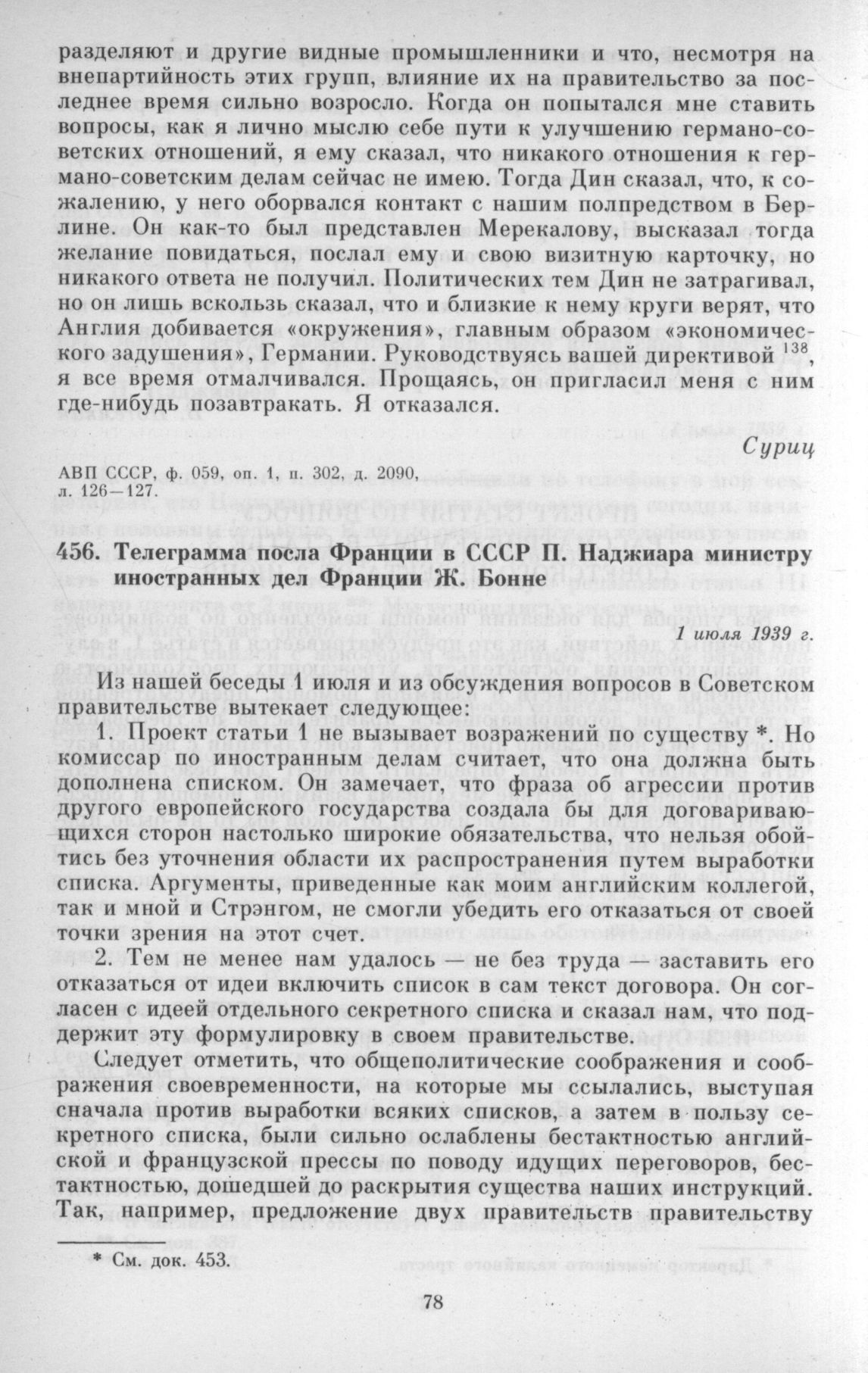 Телеграмма посла Франции в СССР П. Наджиара министру иностранных дел Франции Ж. Бонне. 1 июля 1939 г. // Documents diplomatiques francais... 2 serie. T. XVII. P. 125 — 127.