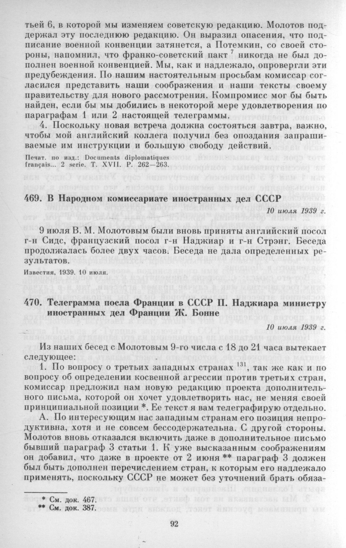 Телеграмма посла Франции в СССР П. Наджиара министру иностранных дел Франции Ж. Бонне. 10 июля 1939 г. // Documents diplomatiques francais... 2 serie. T. XVII. P. 267-268.