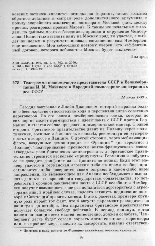 Телеграмма полномочного представителя СССР в Великобритании И. М. Майского в Народный комиссариат иностранных дел СССР. 14 июля 1939 г. // АВП СССР, ф. 059, оп. 1, п. 300, д. 2077, л. 142 — 143.; СССР в борьбе за мир... С. 491—492.