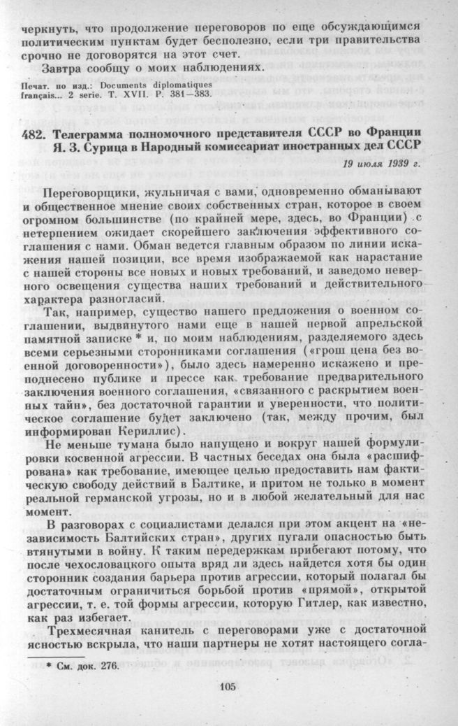 Телеграмма полномочного представителя СССР во Франции Я. 3. Сурица в Народный комиссариат иностранных дел СССР. 19 июля 1939 г. // АВП СССР, ф. 059, оп. 1, п. 302, д. 2090, л. 171 —172.; СССР в борьбе за мир... С. 496—497.