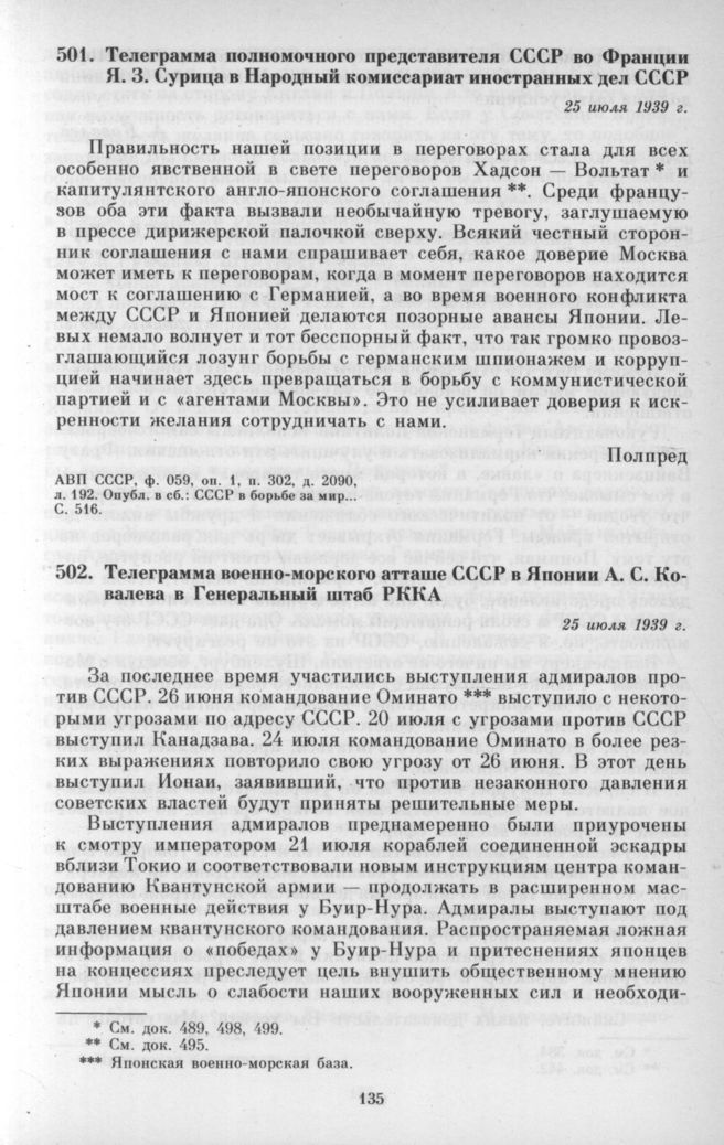 Телеграмма полномочного представителя СССР во Франции Я. 3. Сурица в Народный комиссариат иностранных дел СССР. 25 июля 1939 г. // АВП СССР, ф. 059, оп. 1, п. 302, д. 2090, л. 192.; СССР в борьбе за мир... С. 516.