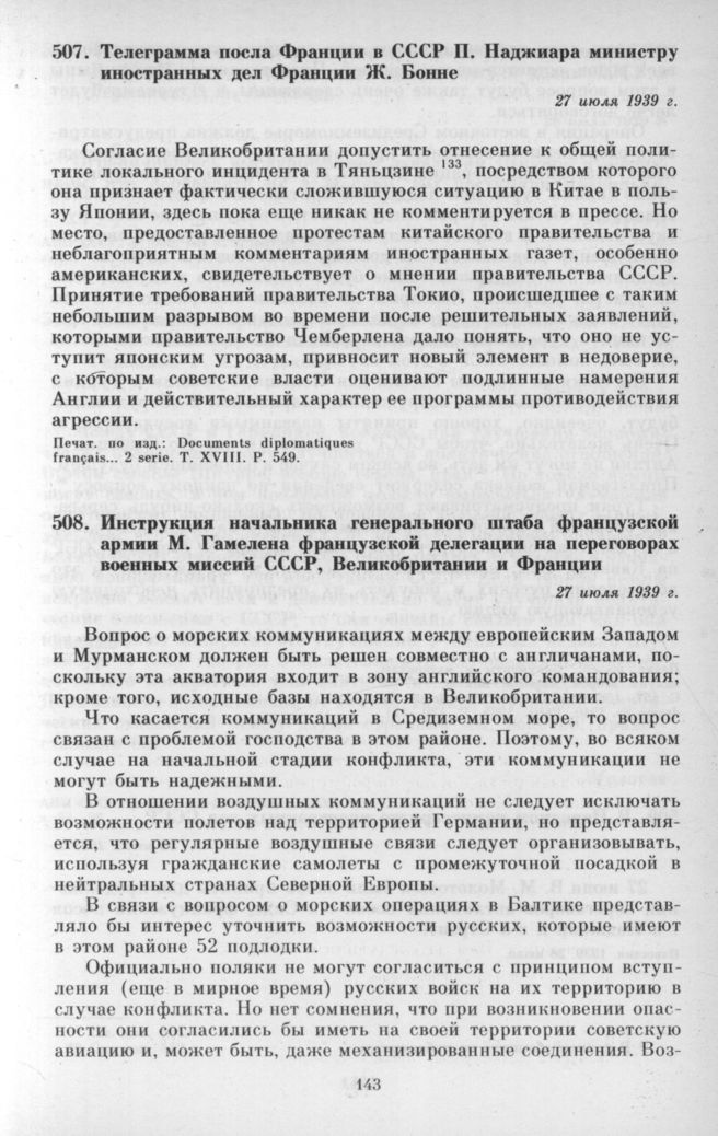 Телеграмма посла Франции в СССР П. Наджиара министру иностранных дел Франции Ж. Бонне. 27 июля 1939 г. // Documents diplomatiques francais... 2 serie. T. XVIII. P. 549.