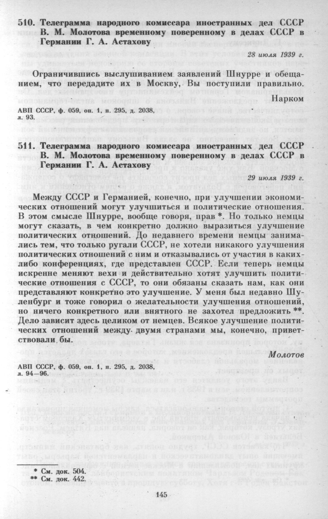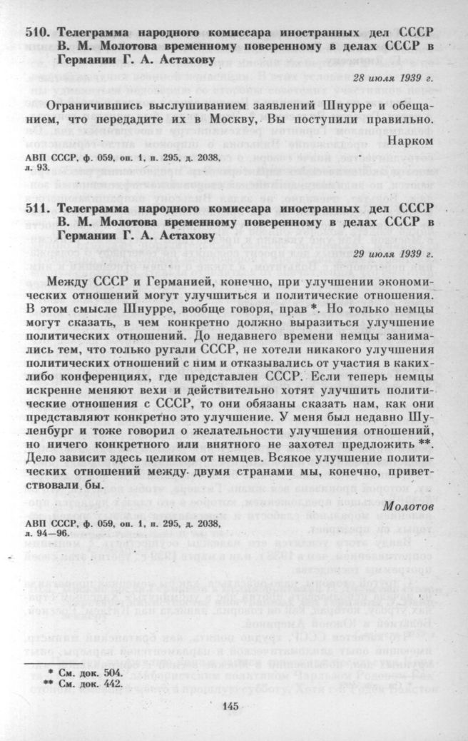 Телеграмма народного комиссара иностранных дел СССР В. М. Молотова временному поверенному в делах СССР в Германии Г. А. Астахову. 29 июля 1939 г. // АВП СССР, ф. 059, оп. 1, п. 295, д. 2038, л. 94 -96.