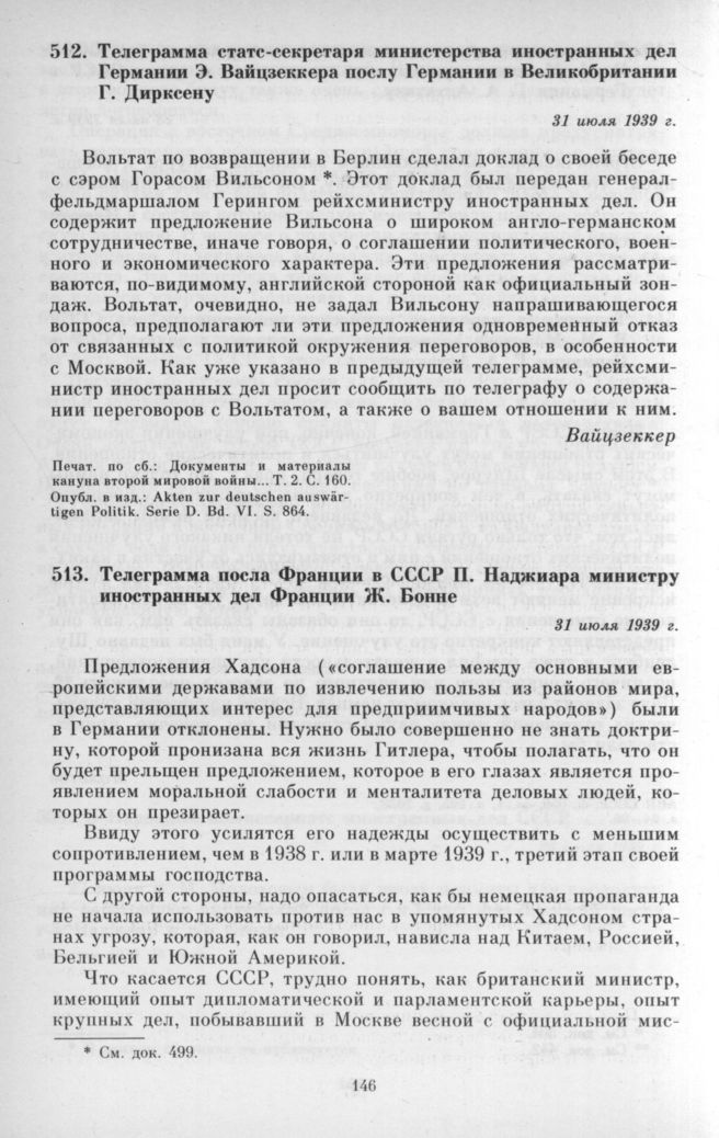 Телеграмма статс-секретаря министерства иностранных дел Германии Э. Вайцзеккера послу Германии в Великобритании Г. Дирксену. 31 июля 1939 г. // Документы и материалы кануна второй мировой войны... Т. 2. С. 160.; Akten zur deutschen auswärtigen Politik. Serie D. Bd. VI. S. 864.