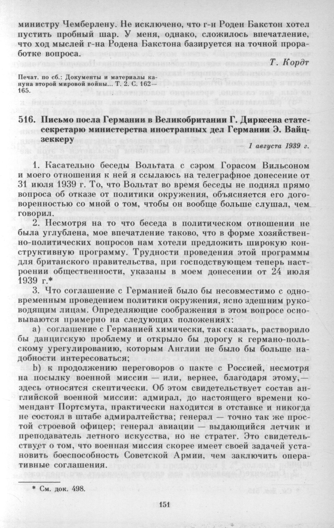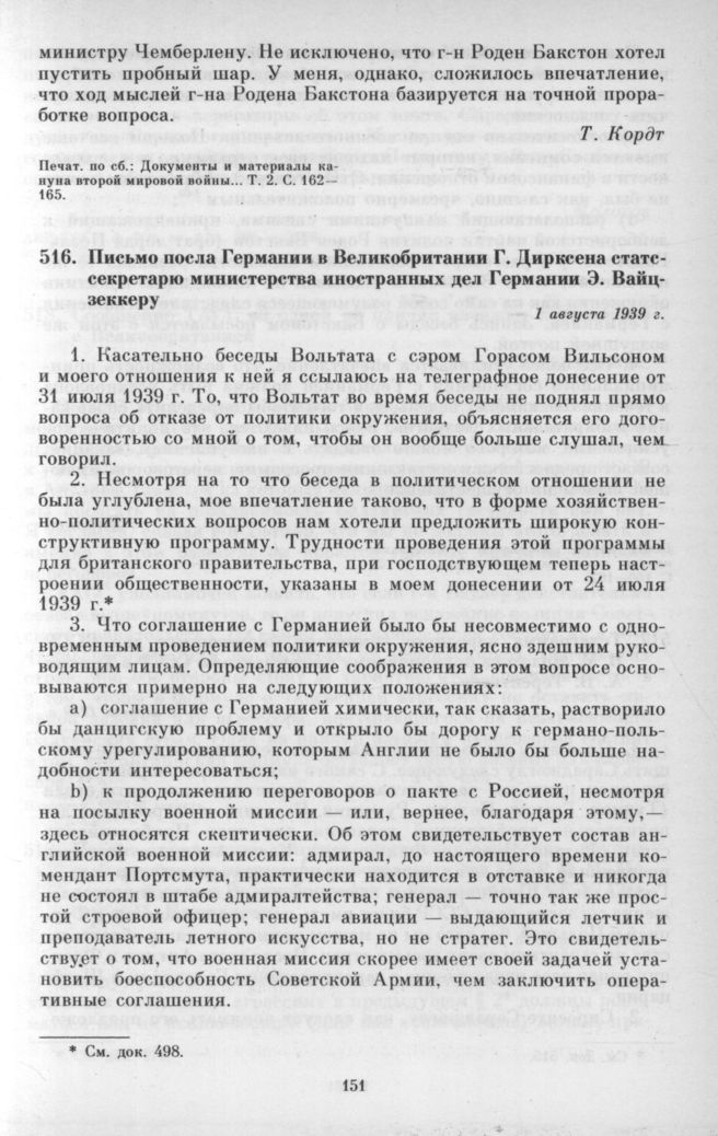 Письмо посла Германии в Великобритании Г. Дирксена статс-секретарю министерства иностранных дел Германии Э. Вайцзеккеру. 1 августа 1939 г. // Документы и материалы кануна второй мировой войны... Т. 2. С. 160-162.