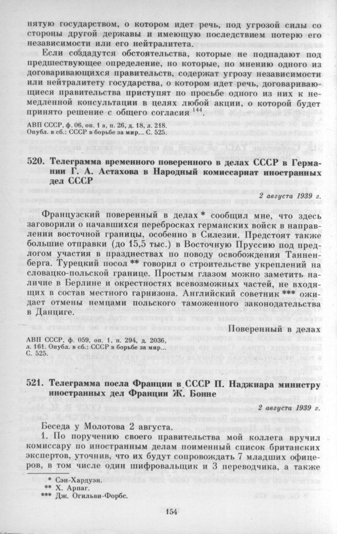 Телеграмма посла Франции в СССР П. Наджиара министру иностранных дел Франции Ж. Бонне. 2 августа 1939 г. // Documents diplomatiques francais... 2 serie. T. XVII. P. 658-660.