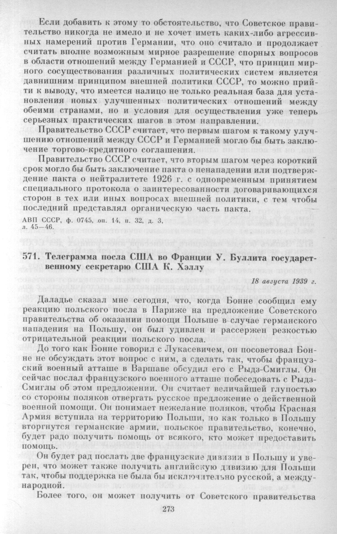 Телеграмма посла США во Франции У. Буллита государственному секретарю США К. Хэллу. 18 августа 1939 г. // Документы и материалы кануна второй мировой войны... Т. 2. С. 308— 309.