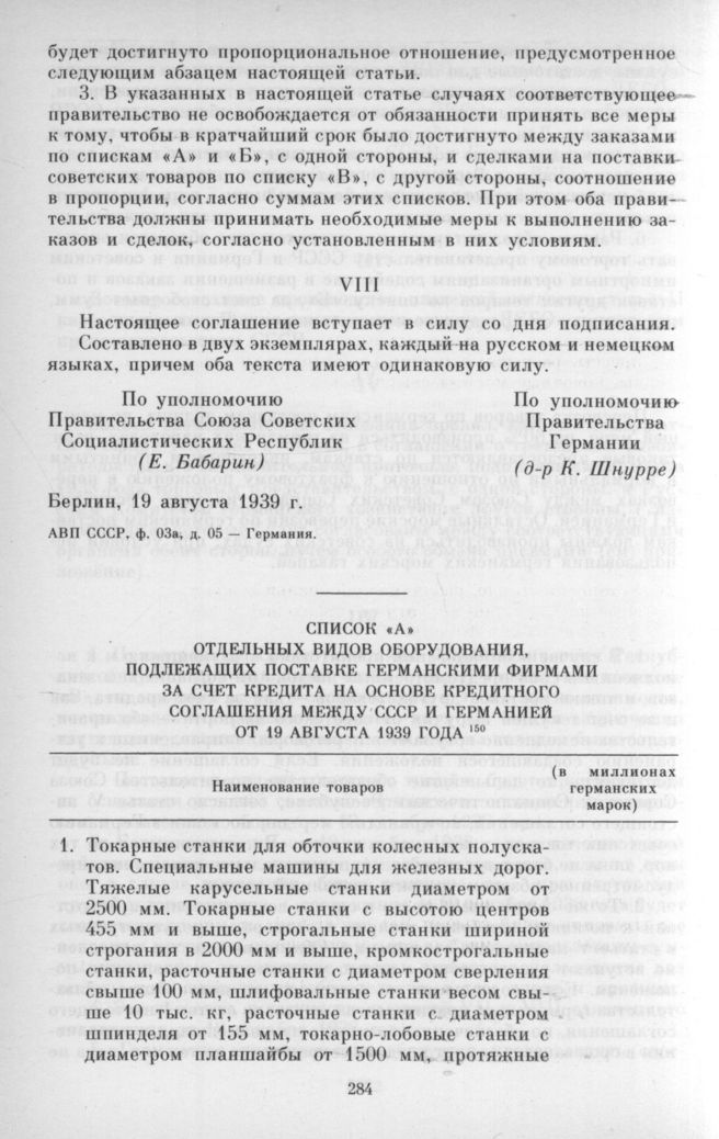 Список «А» отдельных видов оборудования, подлежащих поставке германскими фирмами за счет кредита на основе кредитного соглашения между СССР и Германией от 19 августа 1939 года // АВП СССР, ф. 03а, д. 05 —Германия.