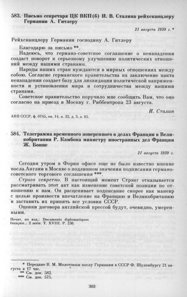 Письмо секретаря ЦК ВКП(б) И. В. Сталина рейхсканцлеру Германии А. Гитлеру. 21 августа 1939 г. // АВП СССР, ф. 0745, оп. 14, п. 32, д. 3, л. 65.