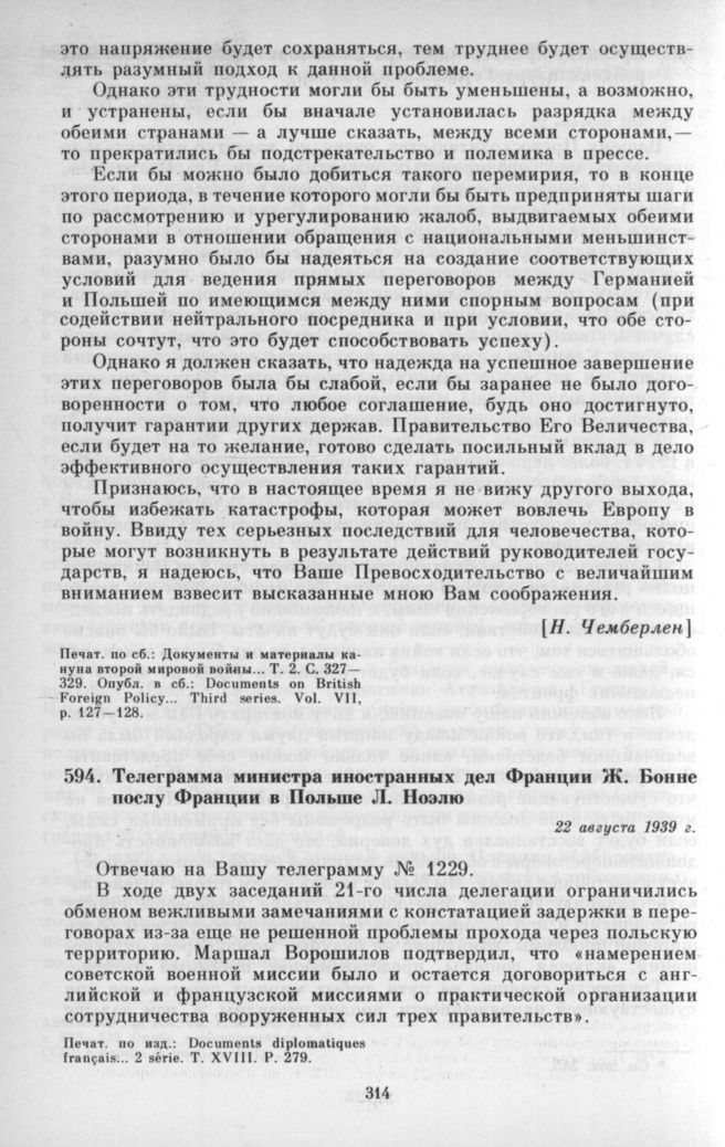 Телеграмма министра иностранных дел Франции Ж. Бонне послу Франции в Польше Л. Ноэлю. 22 августа 1939 г. // Documents diplomatique francais... 2 serie. T. XVIII. P. 279.