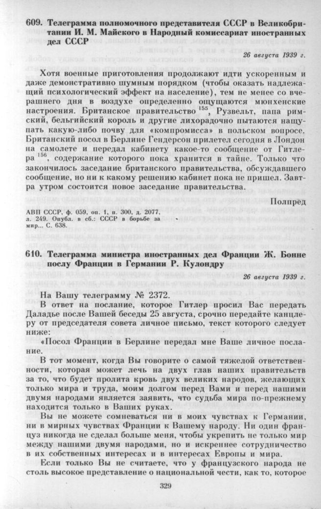 Телеграмма полномочного представителя СССР в Великобритании И. М. Майского в Народный комиссариат иностранных дел СССР. 26 августа 1939 г. // АВП СССР, ф. 059, оп. 1, п. 300, д. 2077, л. 249.; СССР в борьбе за мир... С. 638.