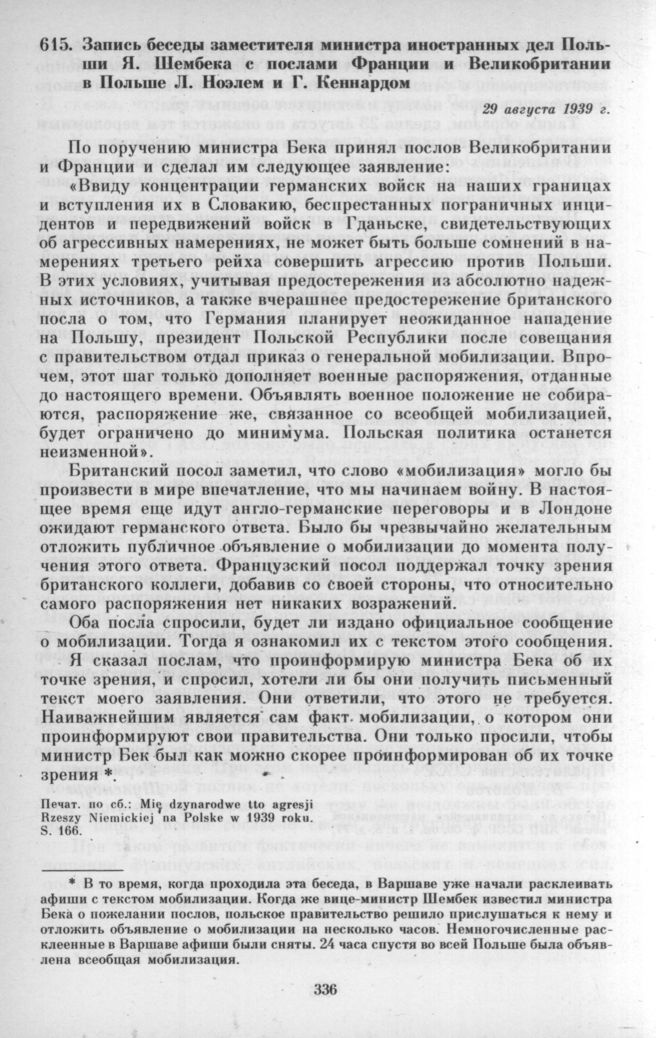 Запись беседы заместителя министра иностранных дел Польши Я. Шембека с послами Франции и Великобритании в Польше Л. Ноэлем и Г. Кеннардом. 29 августа 1939 г. // Miendzynarodowe tto agresji Rzeszy Niemieckiej na Polskę w 1939 roku. Warszawa, 1986. S. 166.