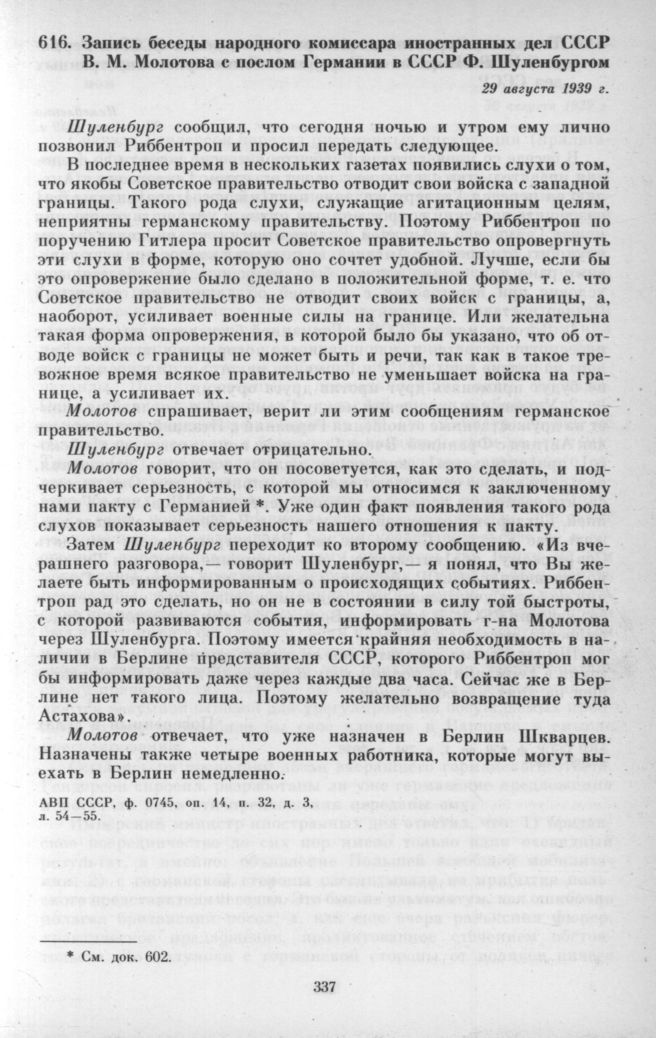 Запись беседы народного комиссара иностранных дел СССР В. М. Молотова с послом Германии в СССР Ф. Шуленбургом. 29 августа 1939 г. // АВП СССР, ф. 0745, оп. 14, п. 32, д. 3, л. 54 - 55.