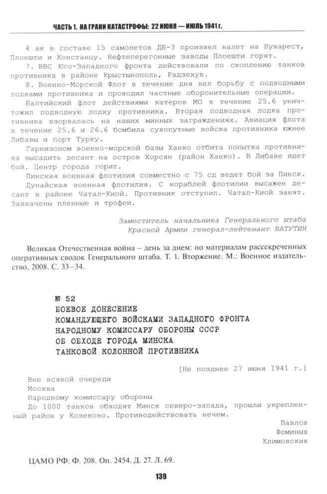 Боевое донесение командующего войсками Западного фронта народному комиссару обороны СССР об обходе города Минска танковой колонной противника. [Не позднее 27 июня 1941 г.] // ЦАМО РФ. Ф. 208. Оп. 2454. Д. 27. Л. 69.