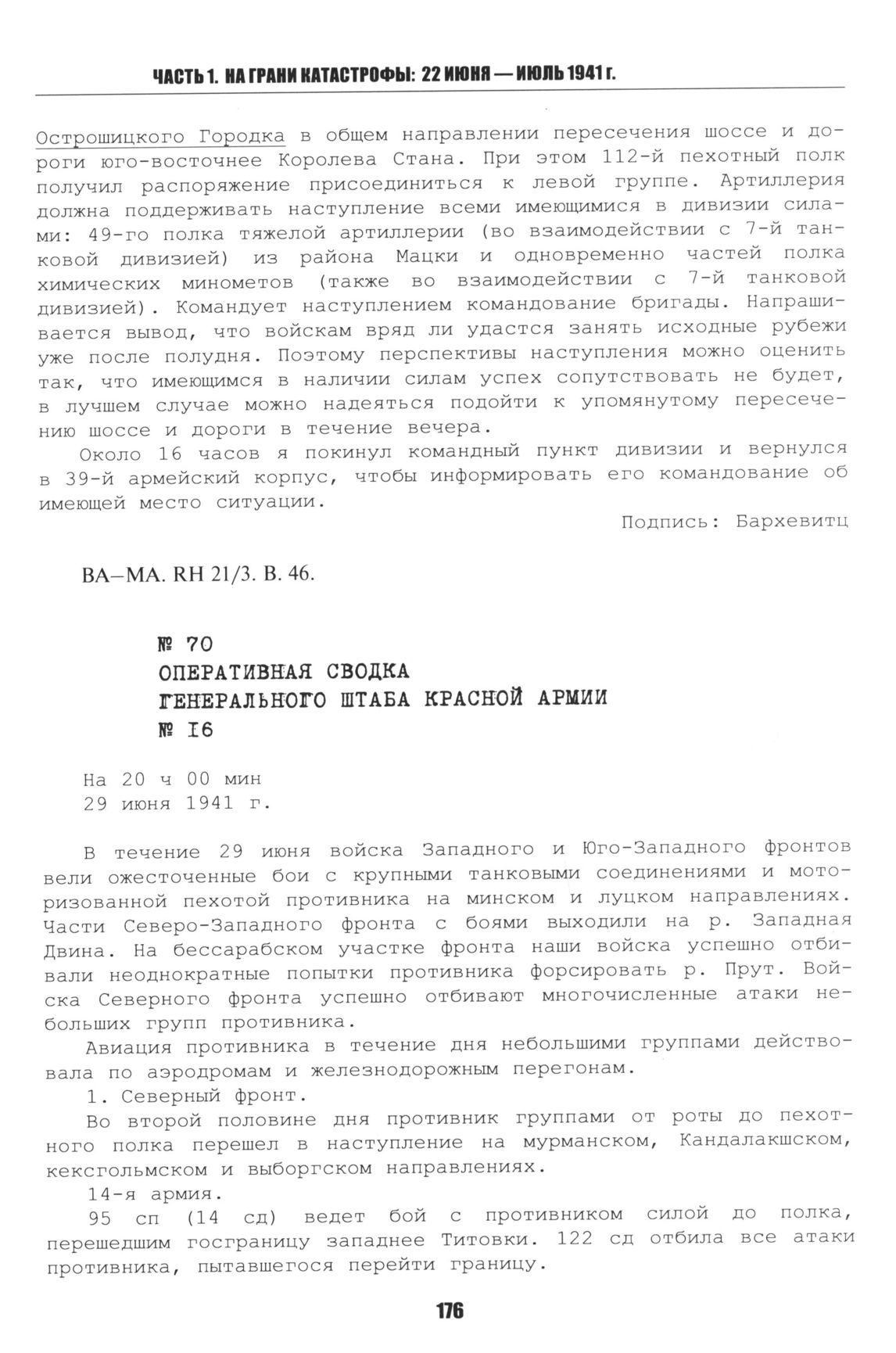Оперативная сводка Генерального штаба Красной Армии № 16. 29 июня 1941 г. // Великая Отечественная война — день за днем: по материалам рассекреченных оперативных сводок Генерального штаба. Т. 1. Вторжение. М.: Военное издательство, 2008. С. 42-44.