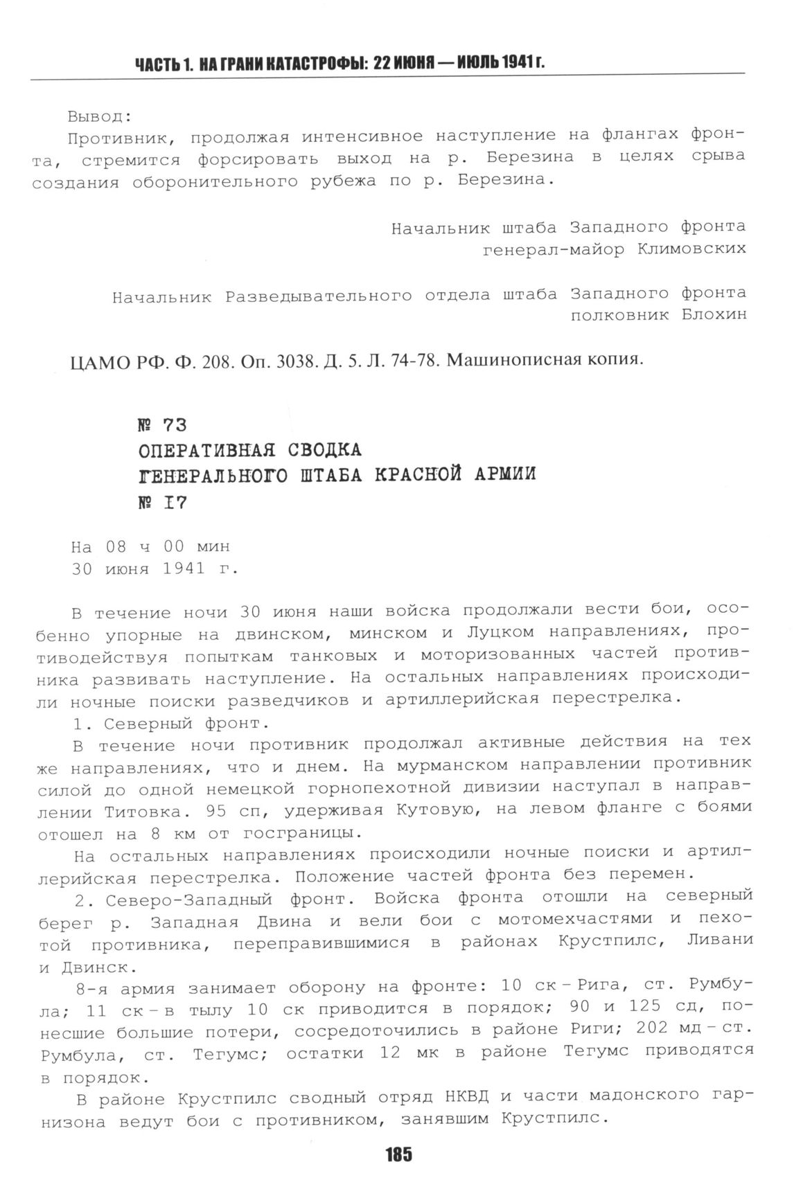 Оперативная сводка Генерального штаба Красной Армии № 17. 30 июня 1941 г. // Великая Отечественная война — день за днем: по материалам рассекреченных оперативных сводок Генерального штаба. Т. 1. Вторжение. М.: Военное издательство, 2008. С. 44-45.