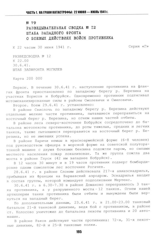 Разведывательная сводка № 12 штаба Западного фронта о боевых действиях войск противника. 30 июня 1941 г. Могилев // ЦАМО РФ. Ф. 208. Оп. 3038. Д. 5. Л. ч. 57—60. Машинописная копия.