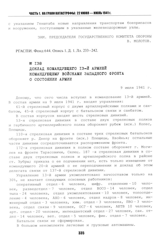 Доклад командующего 13-й армией командующему войсками Западного фронта о состоянии армии. 9 июля 1941 г. // ЦАМО. Ф. 246. Оп. 12928. Д. 6. Л. 6-7.